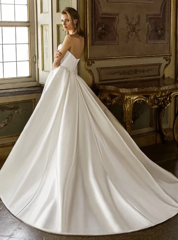 BELINDA is a jaw-dropping, modern take on a minimalist gown. Its sculpted bodice is encrusted with sparkling pearls along the neckline that seamlessly flows into the asymmetrical ruched bodice. This gown’s detachable overskirt allows this gown to transform, with two looks in one. BELINDA also features a high slit that highlights the leg and adds a sexy touch to this sleek and chic stretch Mikado gown.