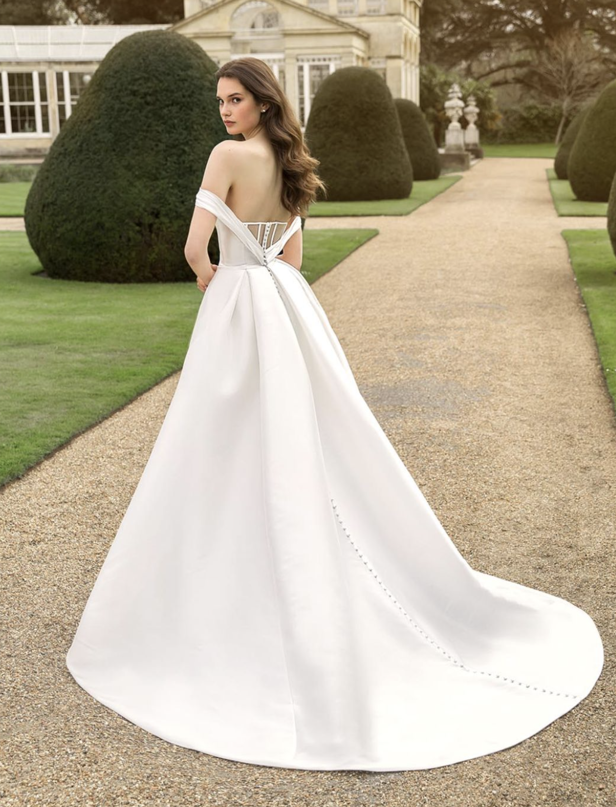 Bring the bridal drama with SADIE and her jaw-dropping A-line split gown silhouette. Featuring a sweetheart neckline that drapes across the bodice for a modern twist, this timeless Mikado gem is made for all our minimalist brides looking to make an effortlessly chic statement. Add a romantic touch with her off-the-shoulder straps that trail down to an eye-catching, illusion corset style back and soft folds that cascade into the train.