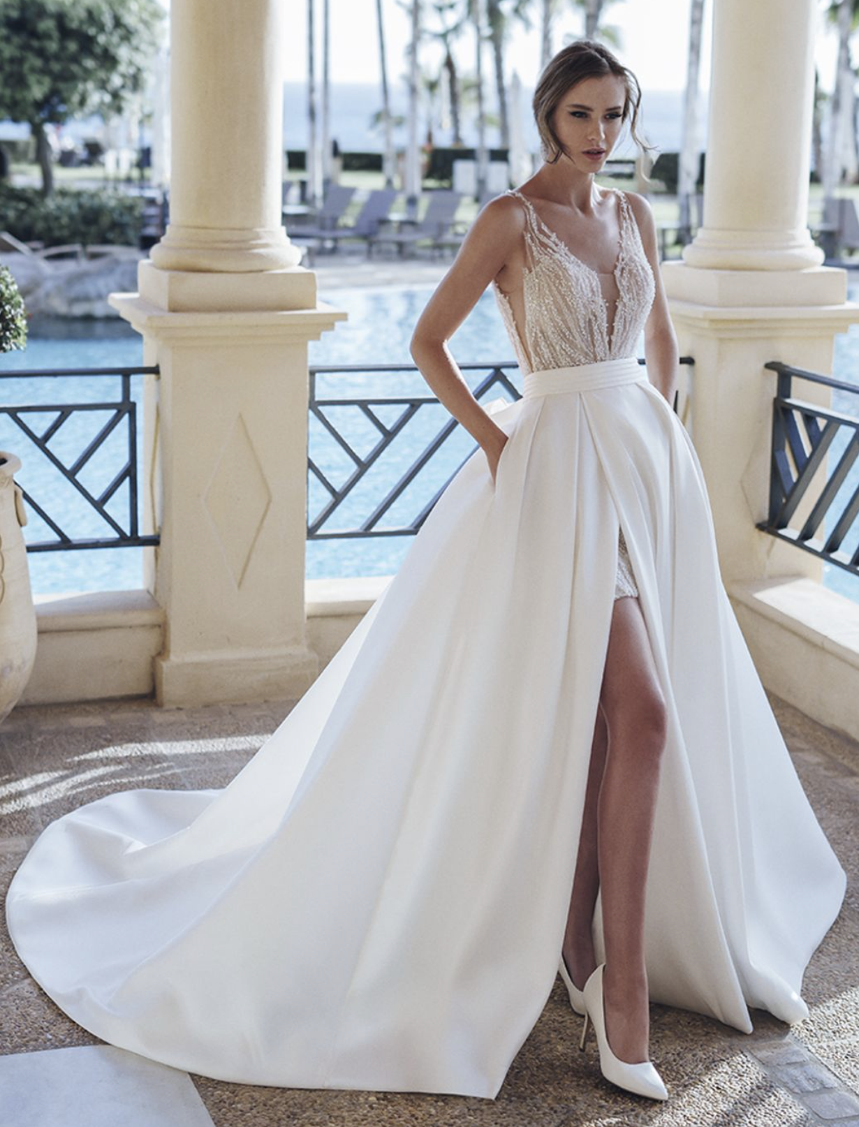 Unlike anything in the Blue by Enzoani collection, STORMI truly gives you two gowns in one! The detachable Mikado overskirt is artfully pleated to cinch the waistline while also creating dramatic volume. After the ceremony, remove the overskirt to reveal a glamorous mini dress adorned with beaded linear lace and sparkling glitter tulle, perfect for dancing the night away. The plunging illusion V-neckline and low back on this gown are extra sexy touches sure to leave a lasting impression on your special day.