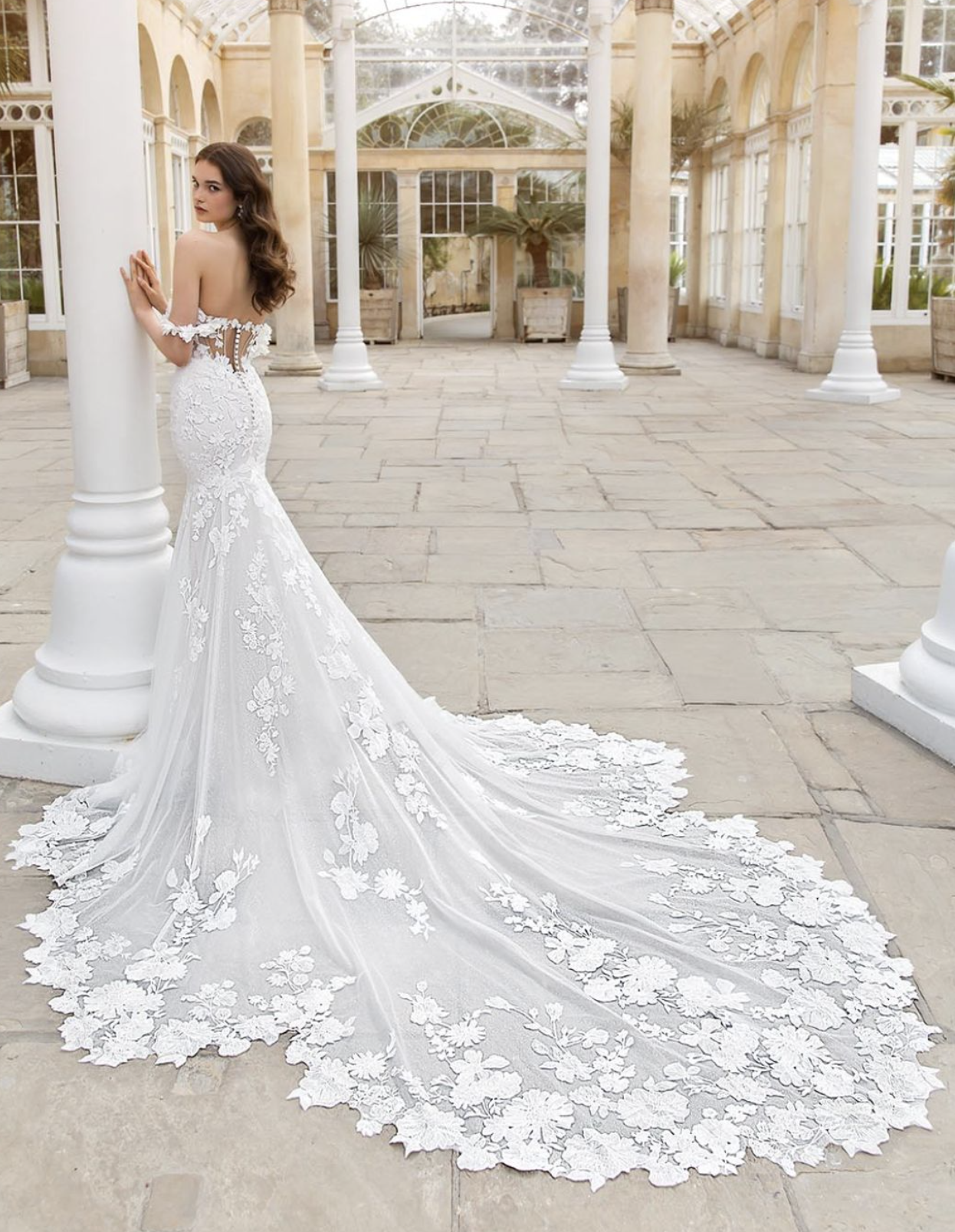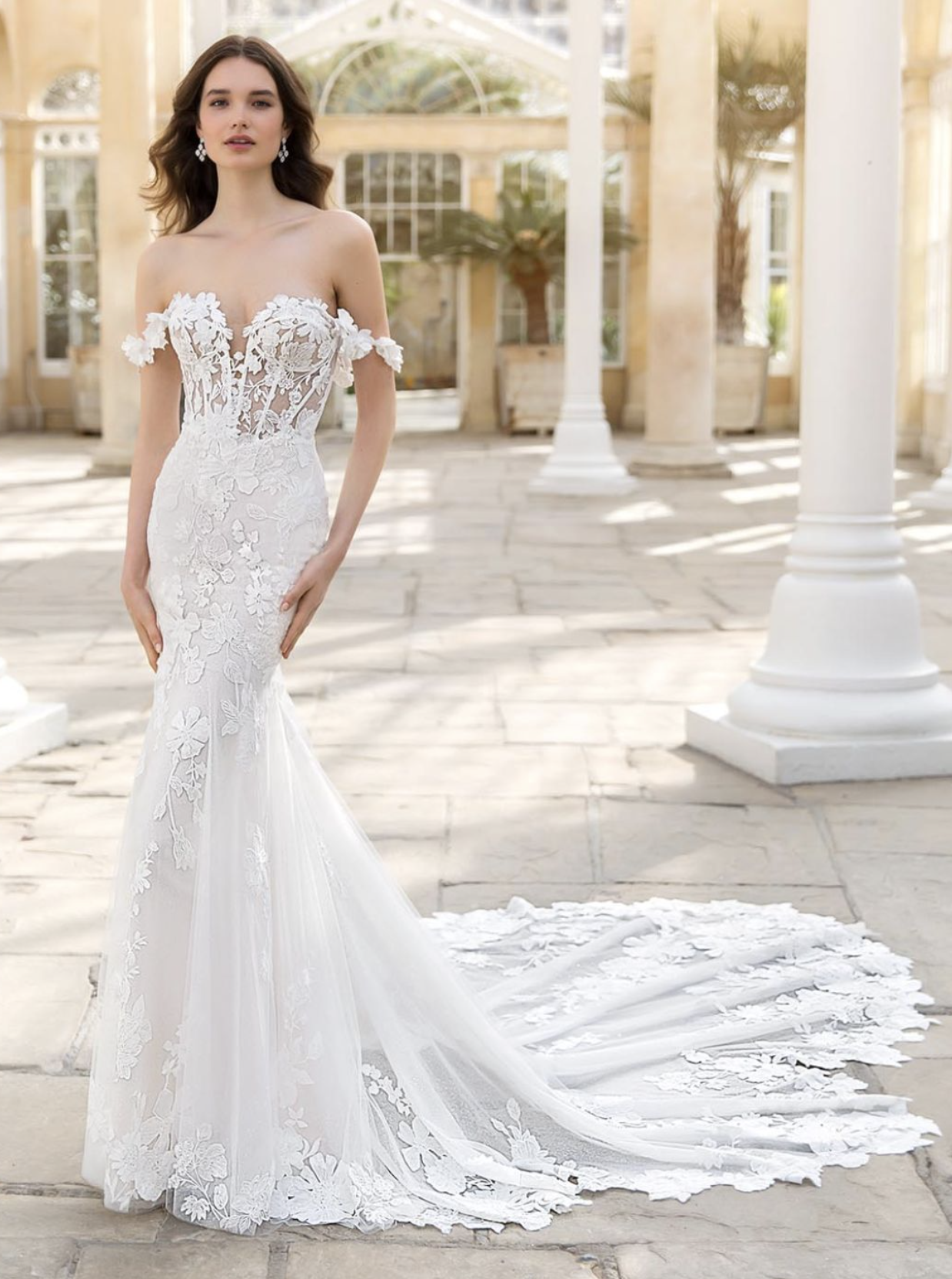 SUMMER is an ultra-glam, exquisitely romantic mermaid wedding dress. Her V-plunge illusion sweetheart corset-styled bodice with exposed boning and detachable, off-the-shoulder 3D floral straps will have all eyes on you. She features a multitude of 3D floral motifs and botanical lace sprinkled throughout the classic fit-and-flare silhouette with shimmering tulle layers for subtle sparkle. Her eyecatching scalloped train with organic finishing adds the perfect finishing touch.